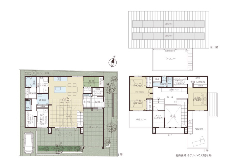 大きな吹き抜けのあるリビングや本格的なガレージ、畳コーナー、ダウンフロアのヌック、2箇所のバルコニーやルーフバルコニーなどこだわり満載です。