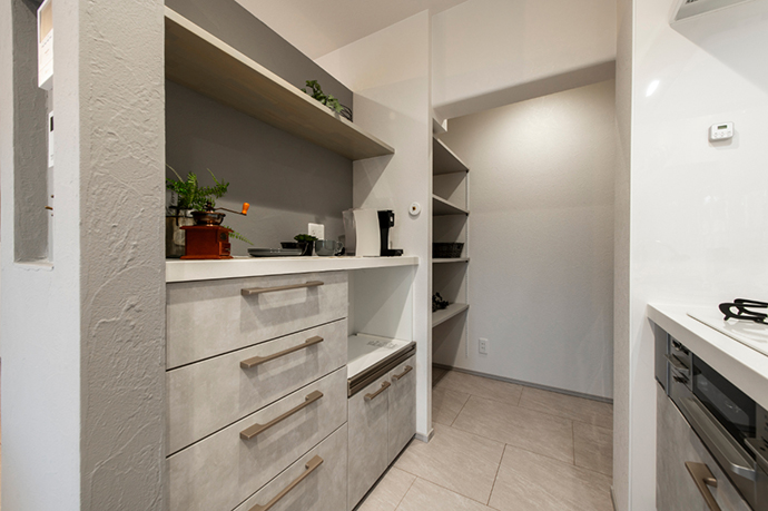 キッチン横のパントリーには冷蔵庫を置くスペースと、ストック用の可動棚を設けています。
