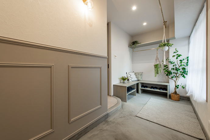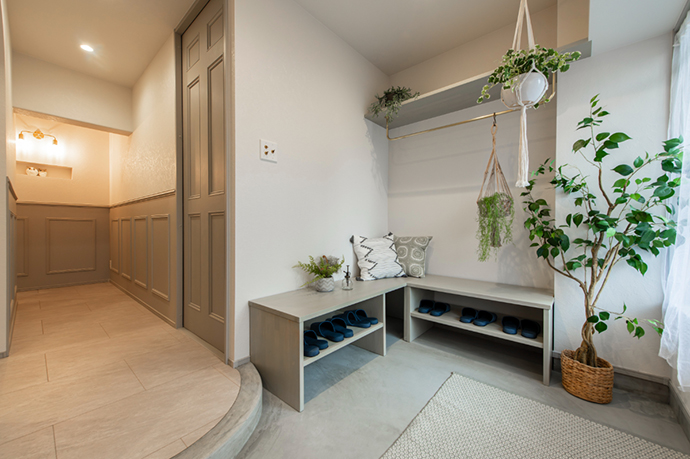 腰壁や玄関ベンチなどの造作は濃グレーでシックに統一。