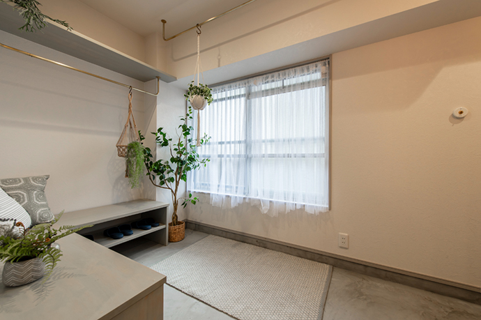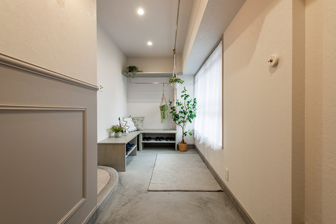 玄関には広めの土間スペースを設け、共用部分に面した窓からの光も取り入れています。