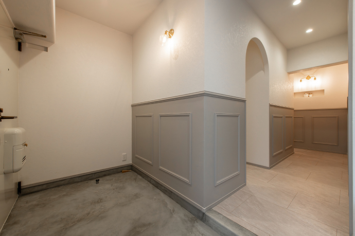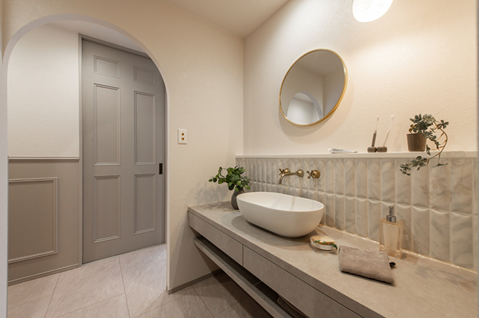 洗面化粧室のアーチ型の入口もポイントです。
