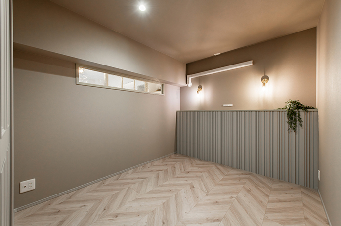 ヘリンボーンの床材や間接照明と相まって、豊かな表情を生み出しています。