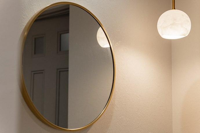 洗面室の鏡は丸い真鍮枠。