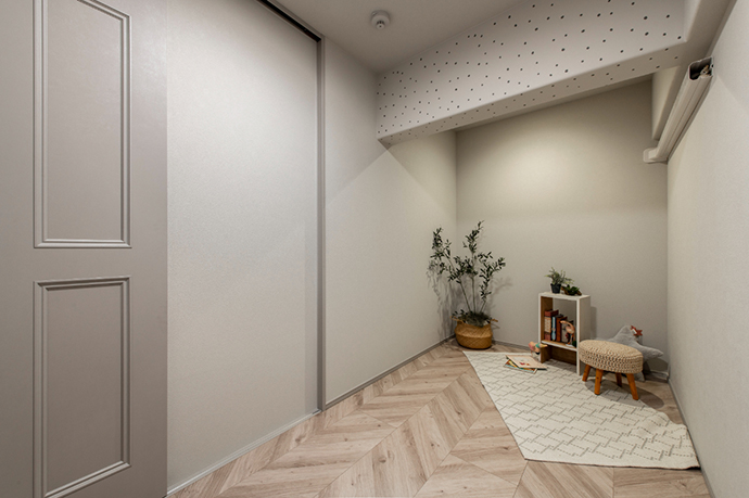 構造上残さざるを得なかった梁には、あえてドット柄のクロスを採用。